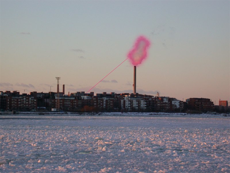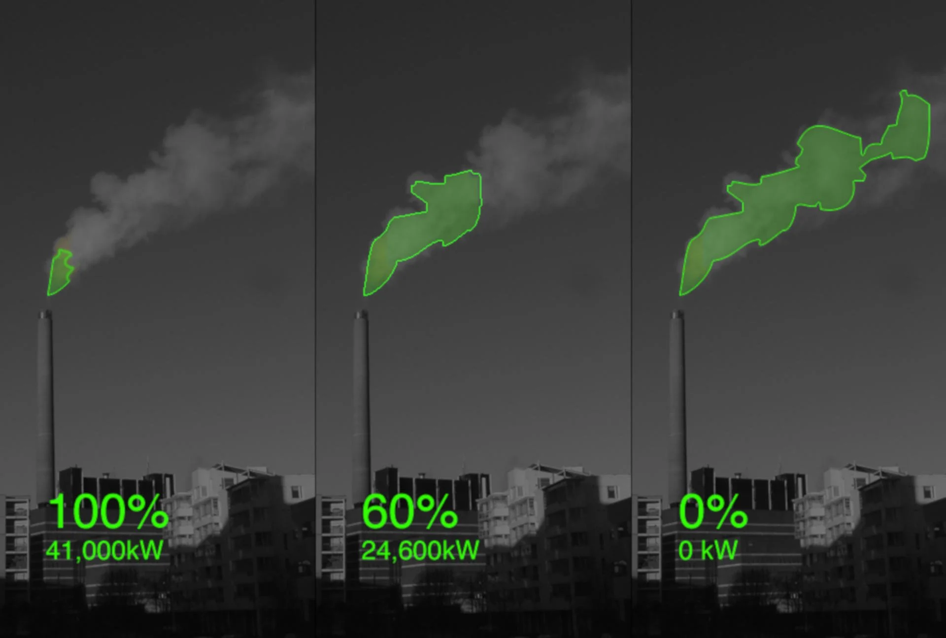 Nuage Vert (‘green cloud’) by artist duo HeHe (Helen Evans and Heiko Hansen @aeroplastics_gallery) brings not just our minds but our collective bodies into contact with energy infrastructure. First realized in Helsinki, Nuage Vert projects a city-scale light installation onto power plant smokestacks, turning its vapor emission clouds green. At night, heat tracking lights will be used to position lasers onto the smoke rings turning them into glowing, communicative artworks. The size of light ebbs and flows based on the community’s daily energy consumption rates.